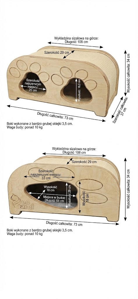 Wielofunkcyjność Górna część mebla pokryta jest długim pasem wykładziny sizalowej (108 cm), pełniąc funkcję poziomego drapaka. Różne kształty wejść z obu stron (duże panoramiczne oraz dwa mniejsze) zapobiegają nudzie i zachęcają do eksploracji.