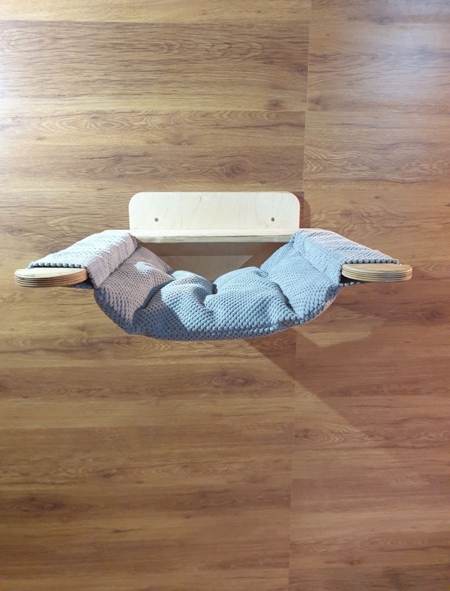 Hamak  montowany do ściany, stelaż drewno sklejka liściasta , tapicerski zdejmowane do prania . Wymiary legowiska  56 x 60 cm . Kolor tapicerki w zakładce materiały obiciowe