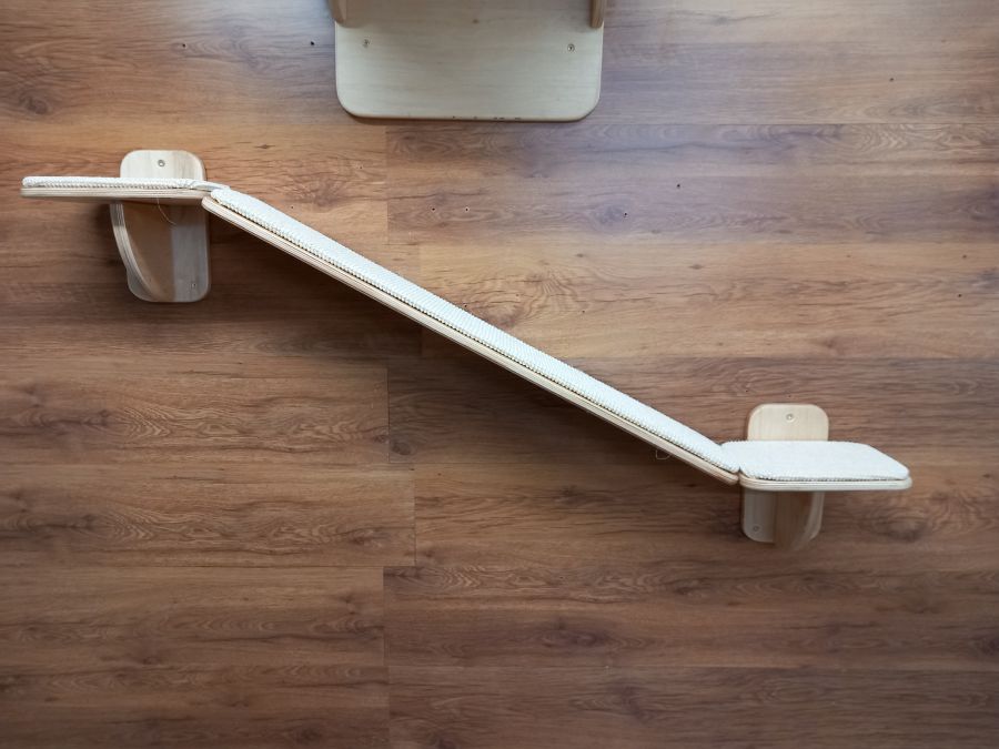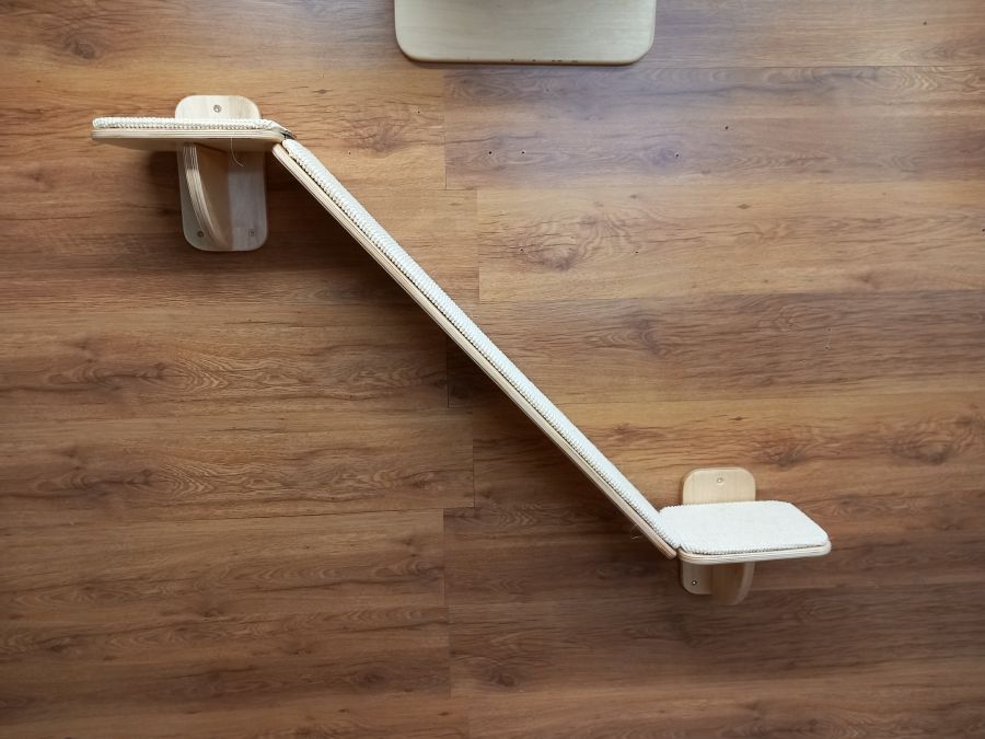 dwie małe półki maja 25x20cm i środkowa część ma 90x20cm pokryta wykładziną sizalową dzięki czemu kot morze się śmiało wspinać i nie poślizgnie się .