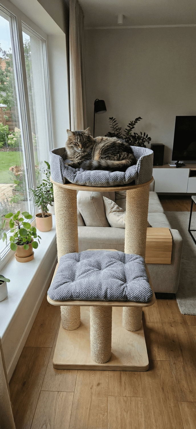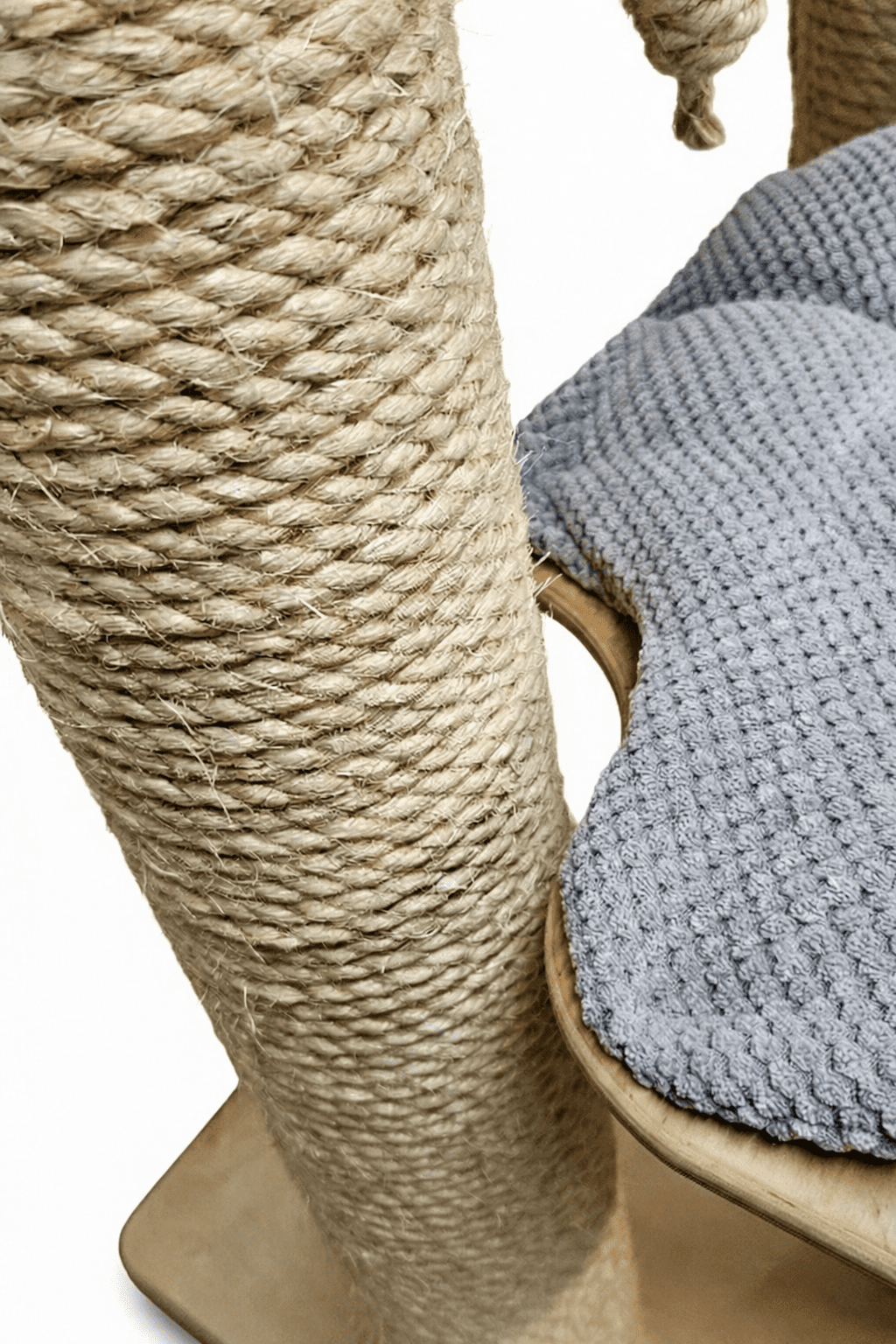 Innowacja: Nieprzerwany Bieg Słupa: To kluczowy atut tego modelu. Dolna półka (60×55 cm) posiada specjalne wycięcia dystansowe, dzięki którym nie łączy się ona fizycznie ze słupami. Efekt? Dwa główne filary o długości 120 cm są owinięte liną od samego dołu aż do szczytu bez żadnych przeszkód. Pozwala to kotu na całkowite, niczym nieskrępowane wyciągnięcie się i wbicie pazurów na dowolnej wysokości – dokładnie jak na naturalnym drzewie.