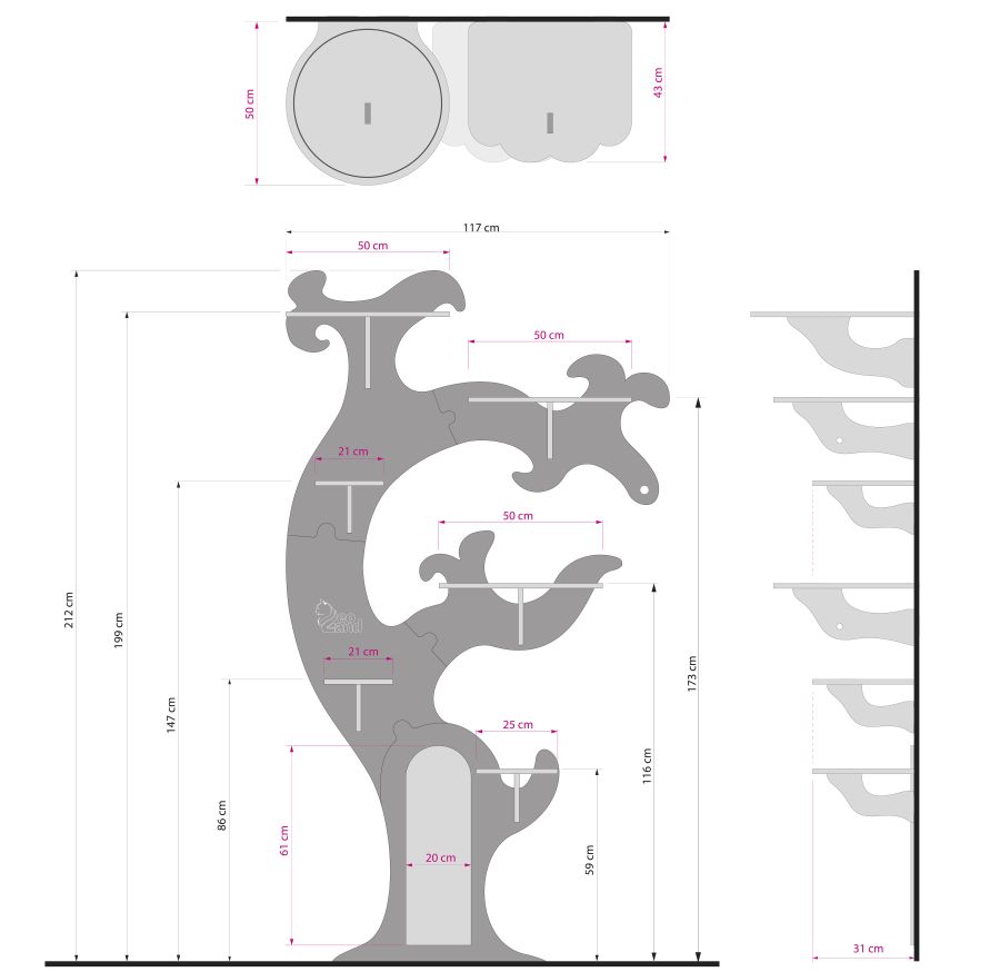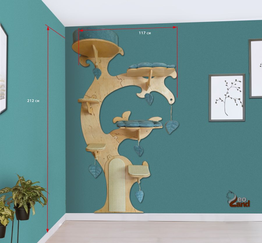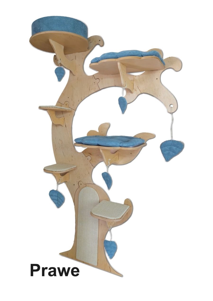 Drapak dla kota o nietypowym ,przypominającym drzewo, kształcie. Jest to mebel przeznaczony do montażu na ścianie i zajmuje mało miejsca. Wymiary: Wysokość całkowita: 212 cm Szerokość: 117 cm