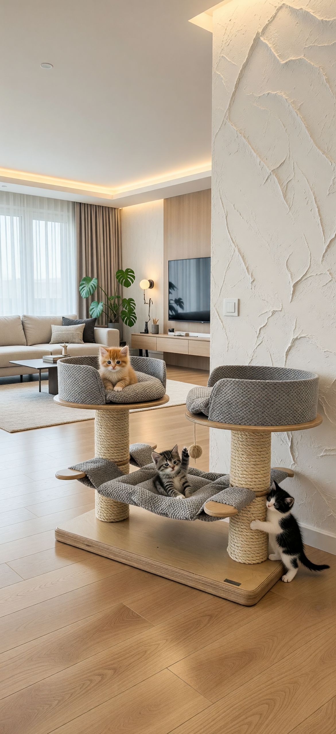 Fundament Bezpieczeństwa: Podstawa o grubości 4,5 cm (76×38 cm) z litej sklejki sprawia, że drapak stoi jak zamurowany. Nawet gdy na konstrukcję wpadnie naraz kilka dorastających kociąt, mebel pozostaje niewzruszony.