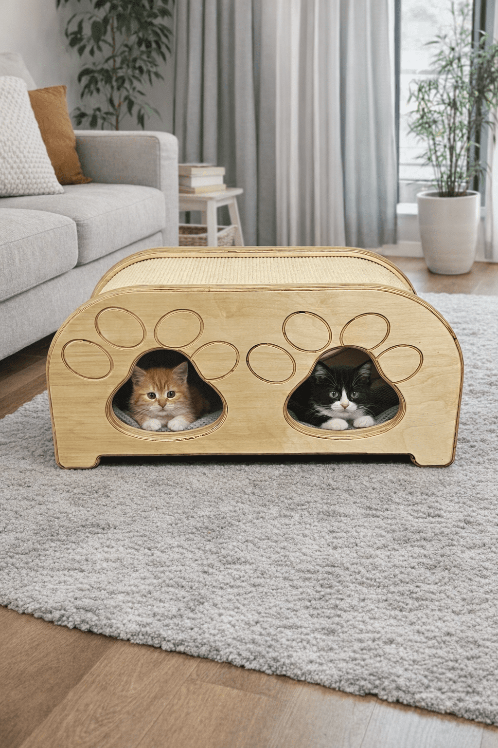 Nieprzewracalna konstrukcja: Zastosowanie sklejki o grubości aż 3,5 cm sprawia, że mebel waży ponad 10 kg. Taka masa gwarantuje absolutną stabilność – budka nie ugnie się pod ciężarem kota, nie przesunie się ani nie zostanie przewrócona, nawet podczas najbardziej dynamicznych zabaw.