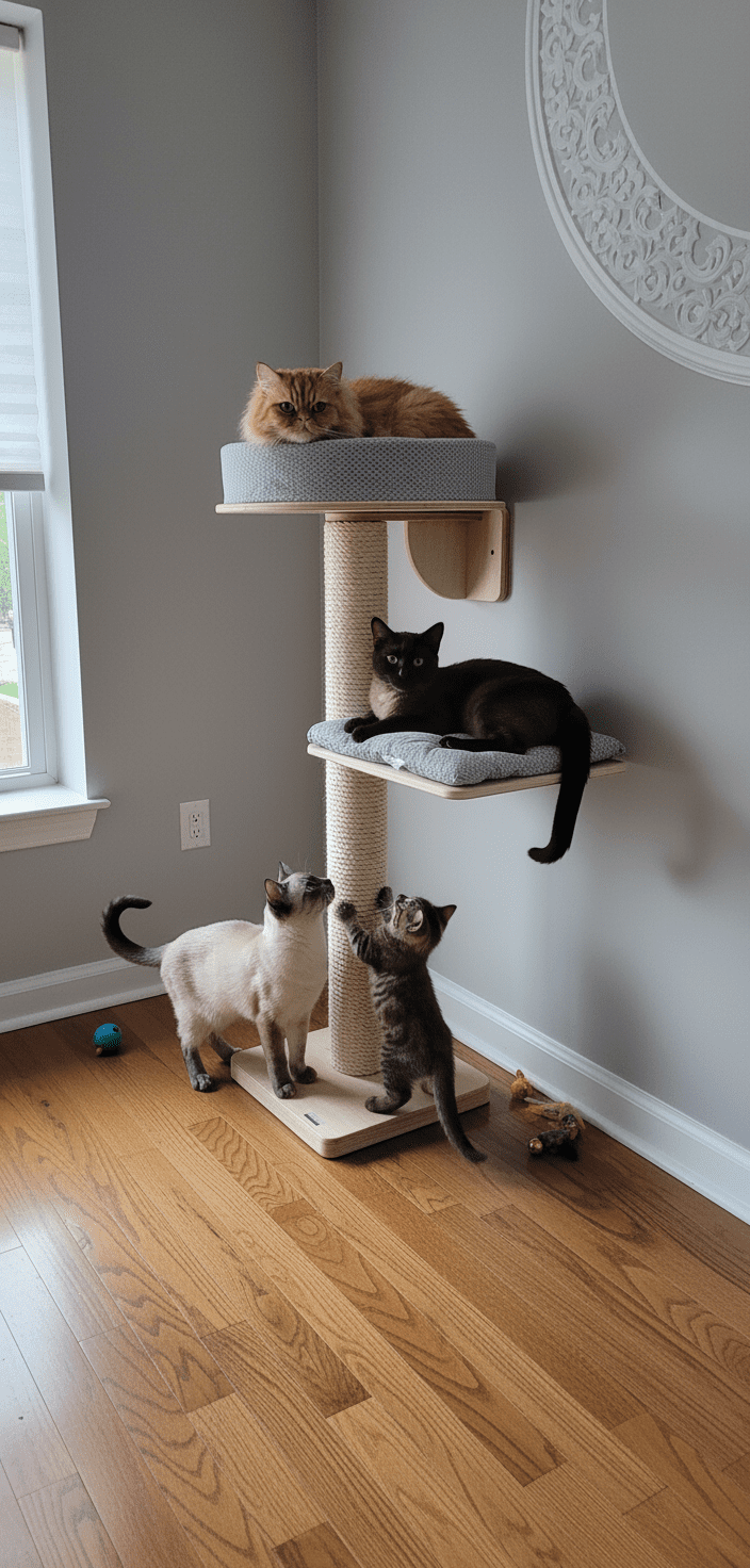 • Oszczędność Miejsca: Mała podstawa (38×38 cm) pozwala zmieścić drapak w każdym kącie.