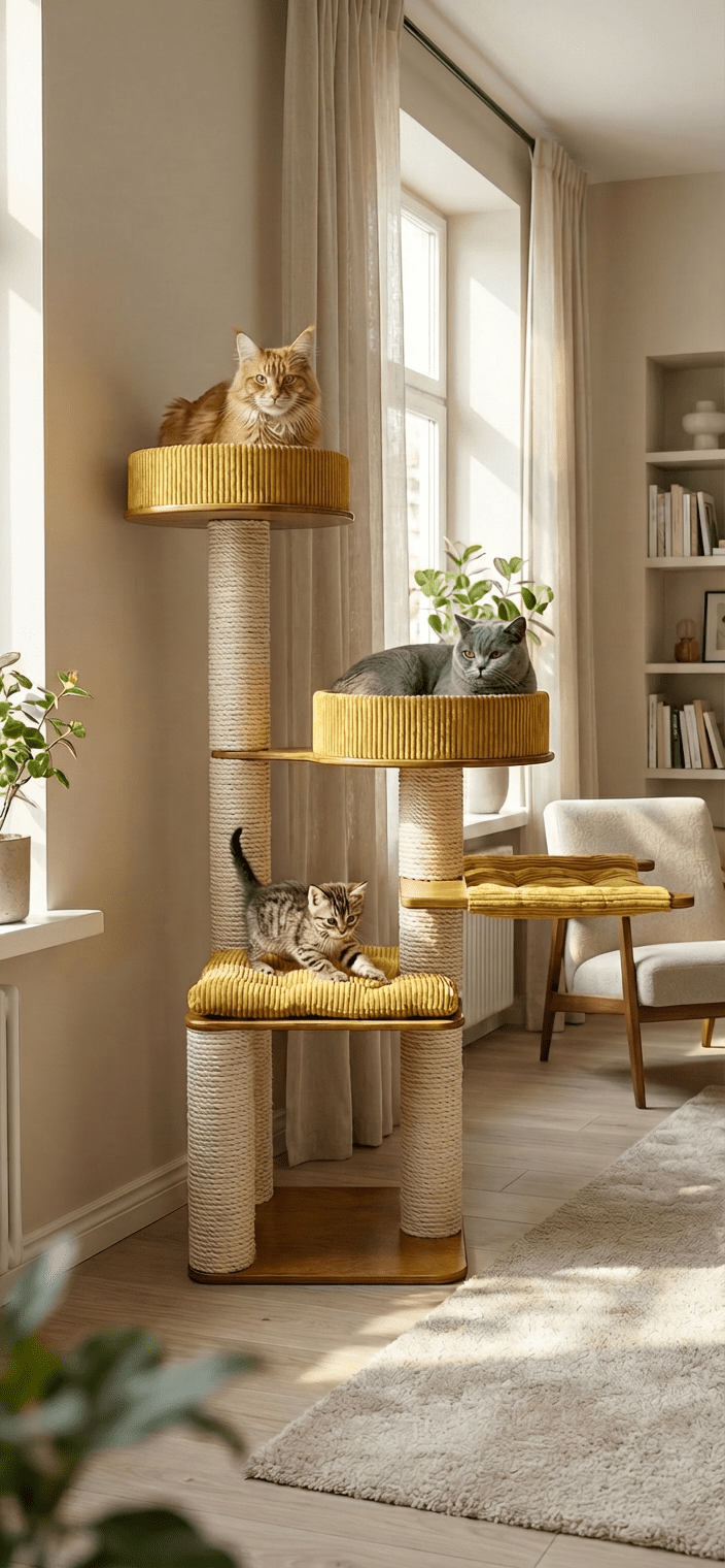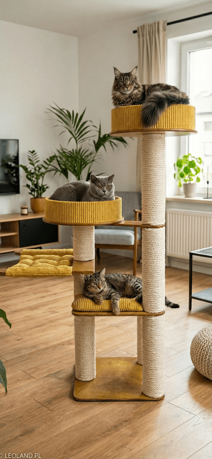 Mebel klasy Premium, łączący funkcję placu zabaw z luksusowym wypoczynkiem dla kilku kotów.