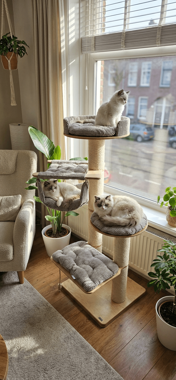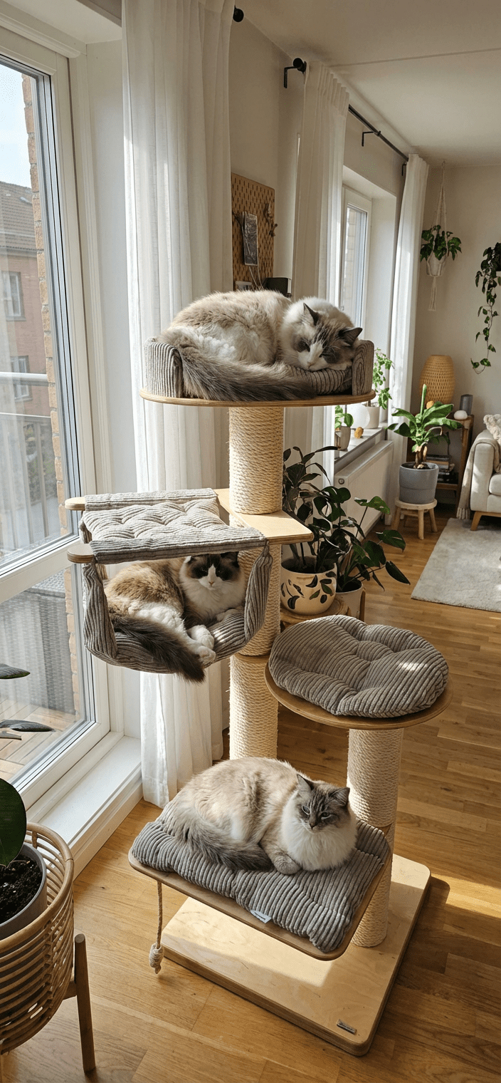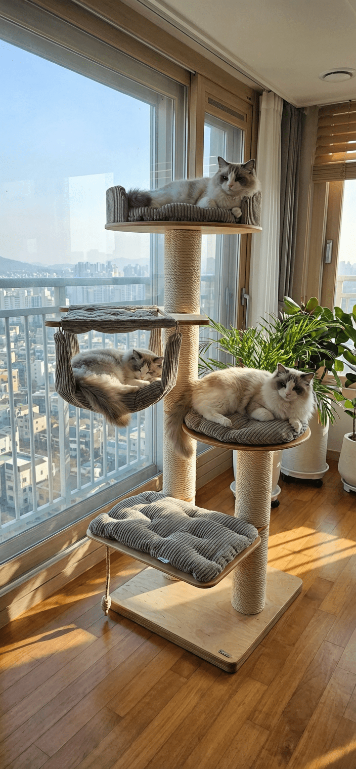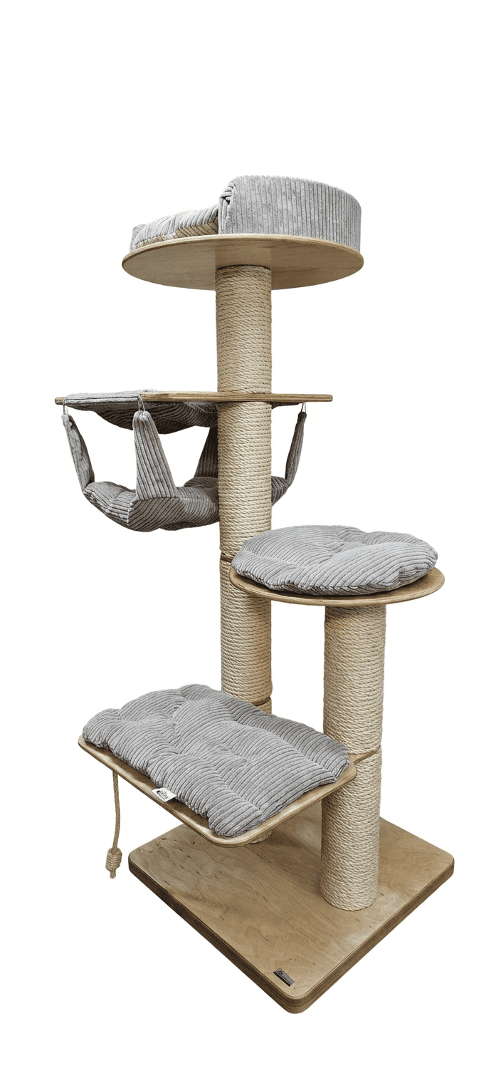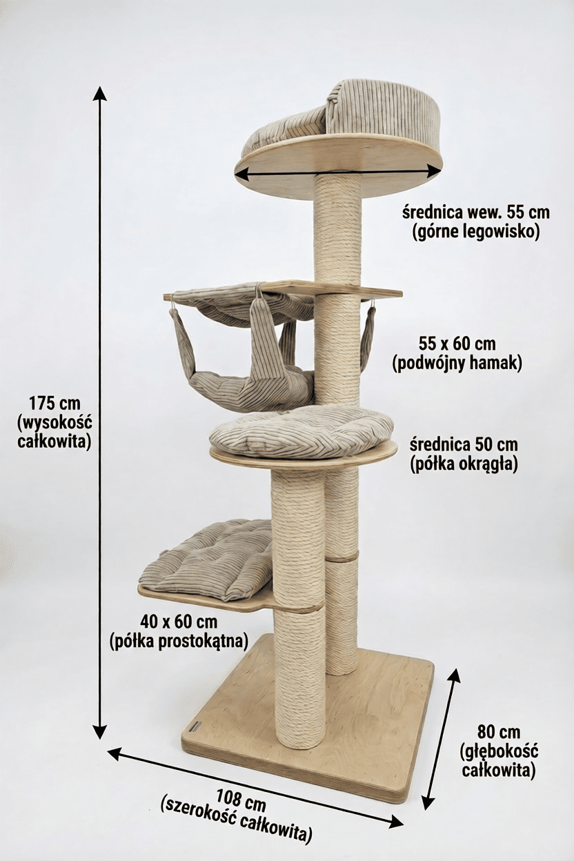 Piramida Wspinaczkowa: Układ poziomów został zaprojektowany tak, aby każdy skok był bezpieczny. Kot podróżuje od prostokątnej półki (40×60 cm), przez półkę okrągłą, aż do hamaka i szczytowej rozety.