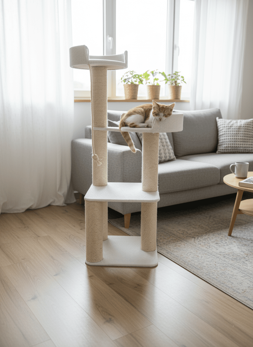 • Luksus na szczycie: Dwie rozety o dużej średnicy wewnętrznej (45 cm) są miękko wyściełane i obite na stałe. To tam koty będą spędzać najwięcej czasu, drzemiąc i obserwując domowników.