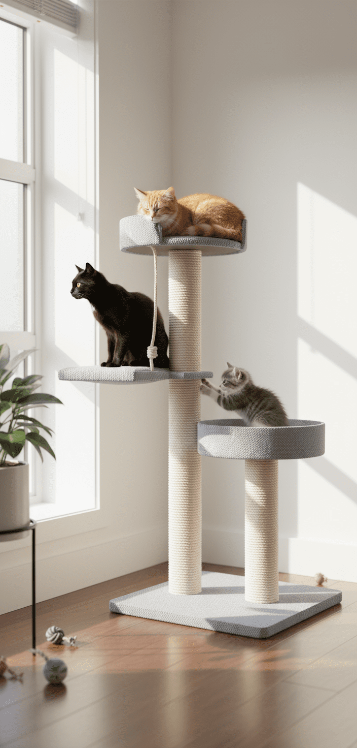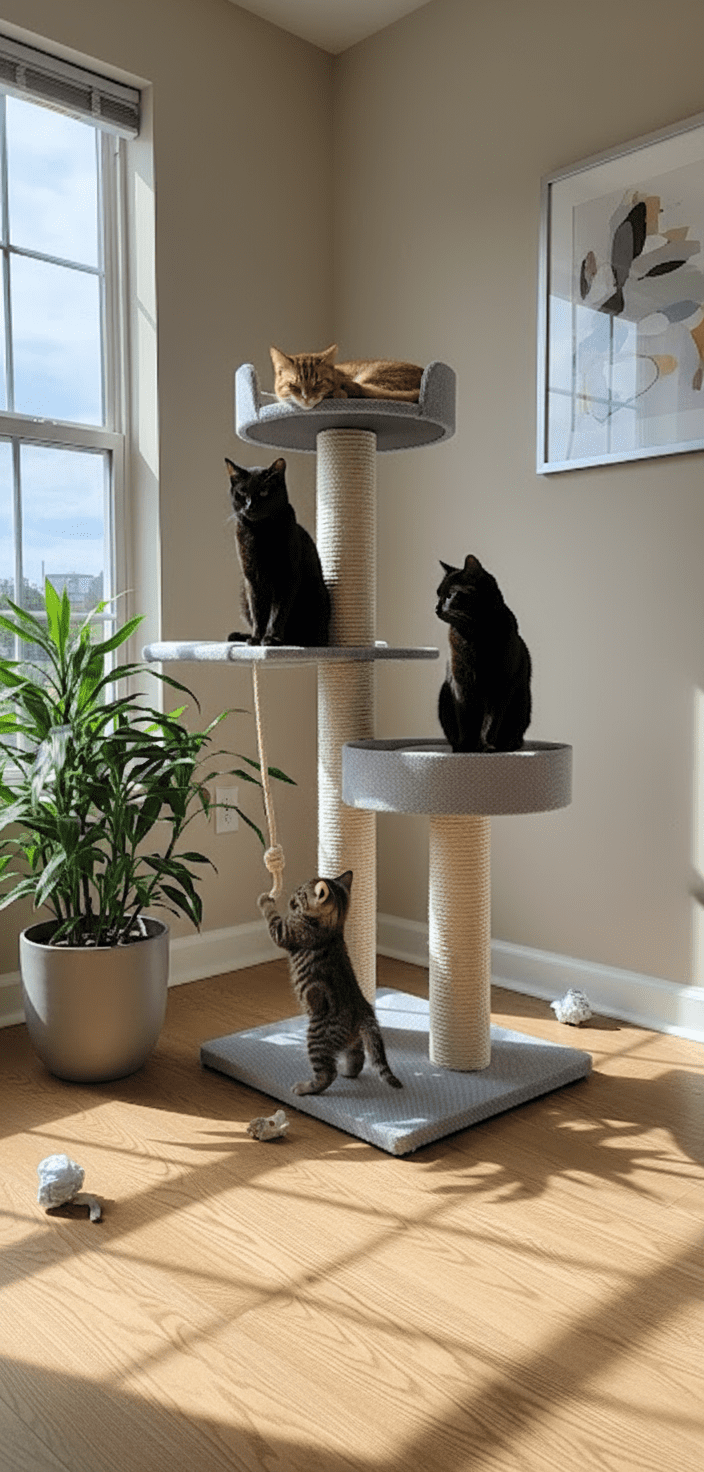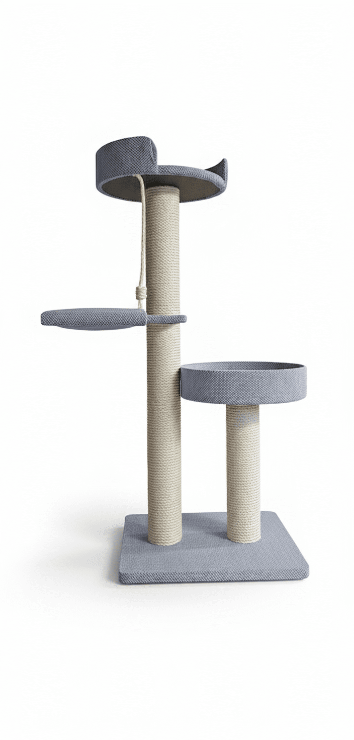 Ścieżka zdrowia: Różne długości słupów (w tym jeden 90-centymetrowy!) pozwalają kotu na pełne wyciągnięcie się podczas drapania, co jest kluczowe dla zdrowia kręgosłupa i mięśni.