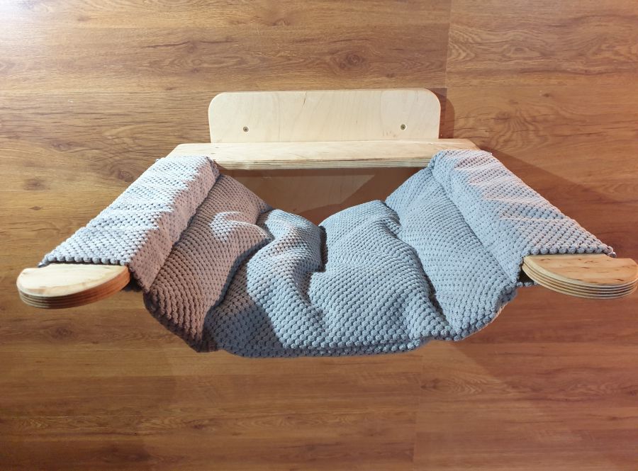 Hamak  montowany do ściany, stelaż drewno sklejka liściasta , tapicerski zdejmowane do prania . Wymiary legowiska  56 x 60 cm . Kolor tapicerki w zakładce materiały obiciowe